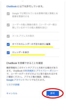 次の画面で「すべてのカレンダーの予定の表示と編集」「カレンダーを表示」の2つにチェックが入っていることを確認し、「許可」をクリックします。