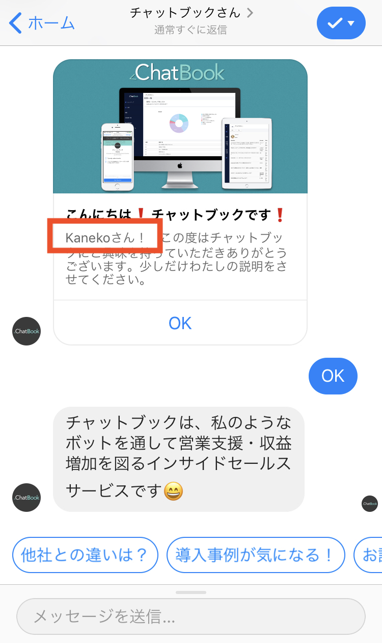 チャットしているユーザーのFacebook登録情報をもとに、自動でメッセージに名前を挿入出来ます。